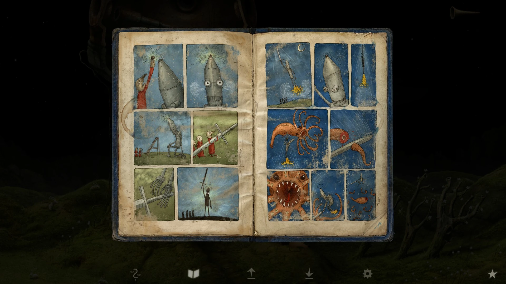 It's on home planet in gnome's home on cupboard. In it there's story about blue ball, robot and octopus.